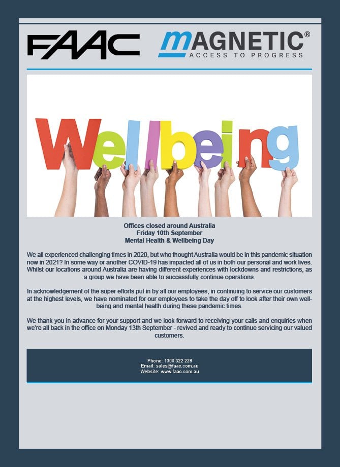 Offices closed around Australia Friday 10th September Mental Health & Wellbeing Day
